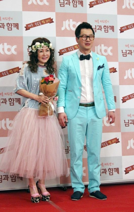 21일 오후 서울 중구 순화동 호암아트홀에서 열린 JTBC 예능프로그램 ‘님과 함께’ 기자간담회에 새커플 박준금과 지상렬이 참여했다. 박준금은 53세라는 나이가 믿기지 않을 정도의 패션으로 등장해 놀라움을 자아냈다. 핑크색의 샤스커트에 블링블링한 상의, 꽃으로 만든 월계관으로 러블리한 패션을 선보였고 지상렬은 하늘색 슈트로 한껏 멋을 냈다. 특히 부부의 날을 맞아 지상렬이 박준금에게 꽃다발을 선물해 눈길을 끌기도 했다.