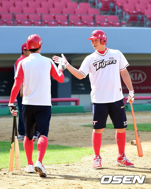 경기에 앞서 KIA 김주형이 고영우와 하이파이브를 하고 있다.
