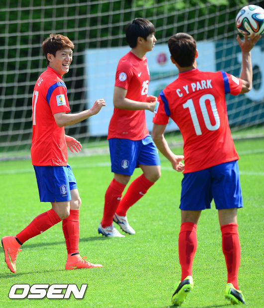 21일 오후 경기도 파주시 파주 NFC(대표팀 트레이닝센터)에서 브라질 월드컵에서 사상 첫 원정 8강에 도전하는 축구 국가대표팀이 훈련 중 이청용과 기성용이 환하게 웃고 있다.