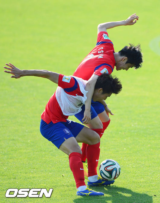 21일 오후 경기도 파주시 파주 NFC(대표팀 트레이닝센터)에서 브라질 월드컵에서 사상 첫 원정 8강에 도전하는 축구 국가대표팀이 훈련 중 미니게임을 할때 이용과 김창수가 볼 다툼을 하고 있다.