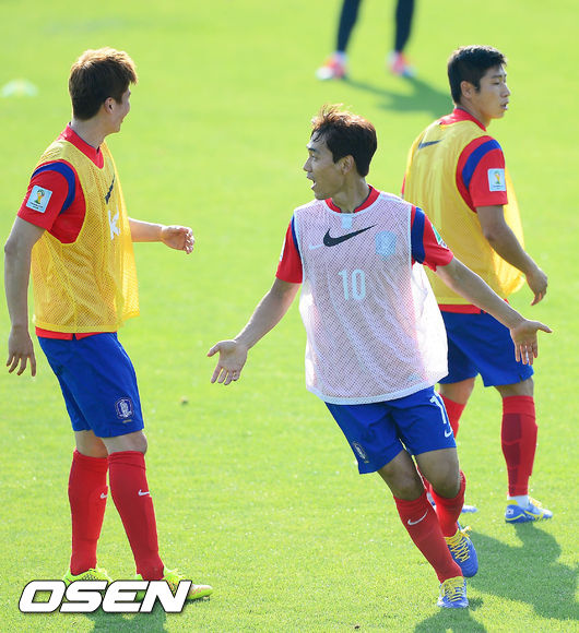 21일 오후 경기도 파주시 파주 NFC(대표팀 트레이닝센터)에서 브라질 월드컵에서 사상 첫 원정 8강에 도전하는 축구 국가대표팀이 훈련 중 미니게임을 할때 박주영이 항의를 하고 있다.
