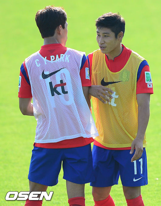 21일 오후 경기도 파주시 파주 NFC(대표팀 트레이닝센터)에서 브라질 월드컵에서 사상 첫 원정 8강에 도전하는 축구 국가대표팀이 훈련 중 미니게임을 시작할때 박주영과 이근호가 몸을 밀고 있다.