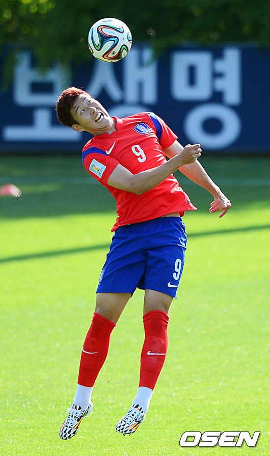 21일 오후 경기도 파주시 파주 NFC(대표팀 트레이닝센터)에서 브라질 월드컵에서 사상 첫 원정 8강에 도전하는 축구 국가대표팀이 훈련 중 손흥민이 헤딩을 하고 있다.
