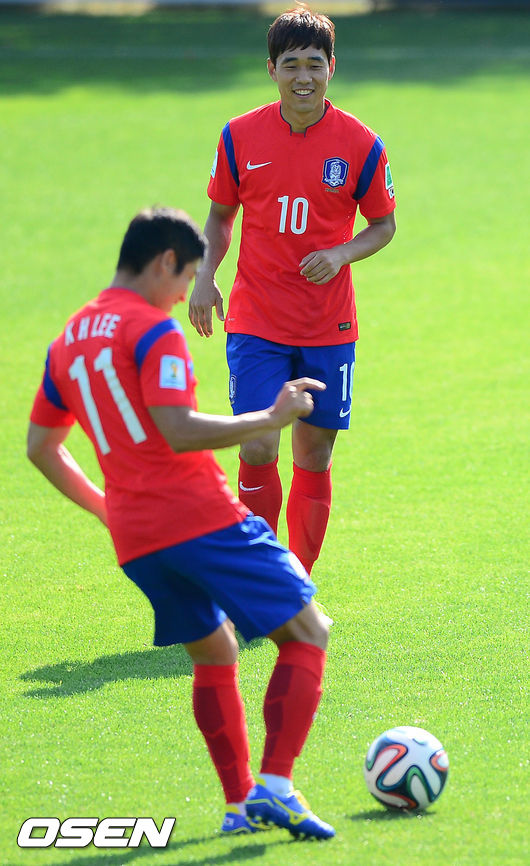 21일 오후 경기도 파주시 파주 NFC(대표팀 트레이닝센터)에서 브라질 월드컵에서 사상 첫 원정 8강에 도전하는 축구 국가대표팀이 훈련 중 박주영과 이근호가 패싱훈련을 하며 환하게 웃고 있다.
