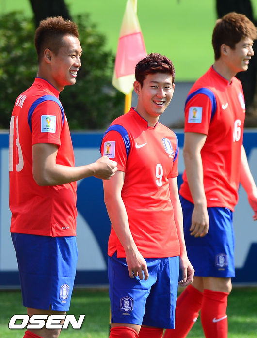 21일 오후 경기도 파주시 파주 NFC(대표팀 트레이닝센터)에서 브라질 월드컵에서 사상 첫 원정 8강에 도전하는 축구 국가대표팀이 훈련을 할때 손흥민과 김신욱이 미소짓고 있다.