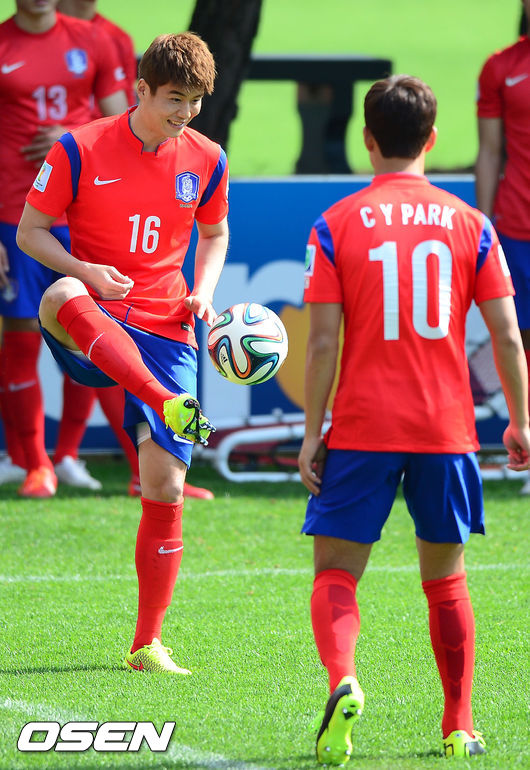 21일 오후 경기도 파주시 파주 NFC(대표팀 트레이닝센터)에서 브라질 월드컵에서 사상 첫 원정 8강에 도전하는 축구 국가대표팀이 훈련을 할때 기성용과 박주영이 패스훈련을 하고 있다.
