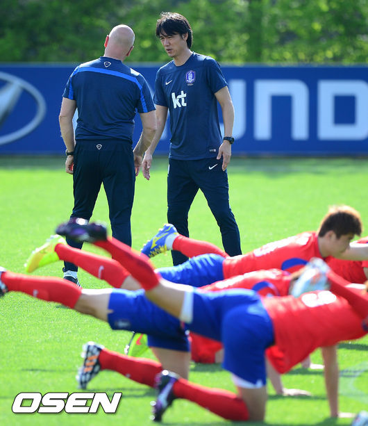 21일 오후 경기도 파주시 파주 NFC(대표팀 트레이닝센터)에서 브라질 월드컵에서 사상 첫 원정 8강에 도전하는 축구 국가대표팀이 훈련을 할때 홍명보 감독이 안톤 두 샤트니에 코치와 얘기를 나누고 있다.