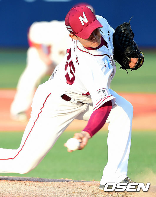 1회초 넥센 선발 김대우가 힘차게 공을 뿌리고 있다.