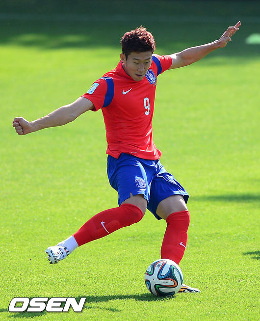 21일 오후 경기도 파주시 파주 NFC(대표팀 트레이닝센터)에서 브라질 월드컵에서 사상 첫 원정 8강에 도전하는 축구 국가대표팀이 훈련을 할때 손흥민이 슛을 하고 있다.