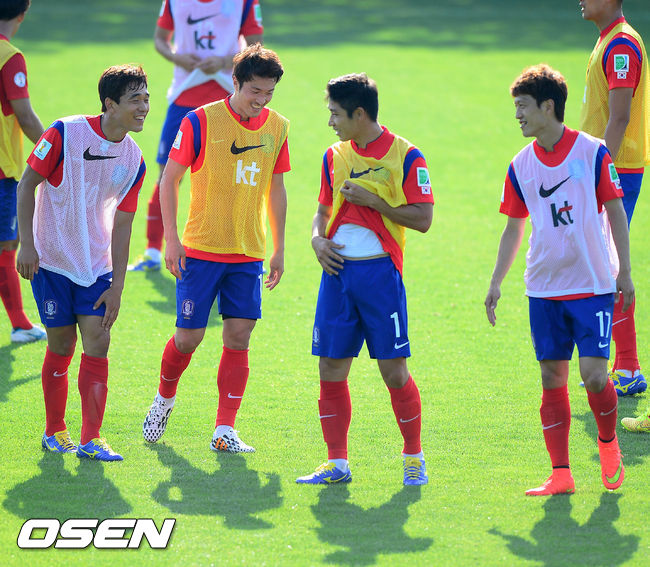 21일 오후 경기도 파주시 파주 NFC(대표팀 트레이닝센터)에서 브라질 월드컵에서 사상 첫 원정 8강에 도전하는 축구 국가대표팀이 훈련을 할때 박주영 박종우 이근호 이청용이 환하게 웃고 있다.