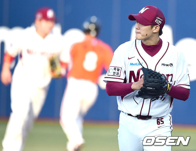 1회초 한화 공격 1사 1루 상황 정근우를 병살타로 이끌며 무실점으로 이닝을 마친 넥센 선발 김대우가 더그아웃으로 들어오고 있다.