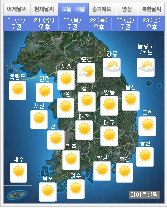 아침에는 해안과 일부 내륙에 안개가 짙게 끼는 곳이 있겠으나 당분간 낮에는 한여름 같은 더위가 계속될 전망이다. 일교차도 10도 이상 차이날 것으로 보여 건강관리에 유의해야 한다.