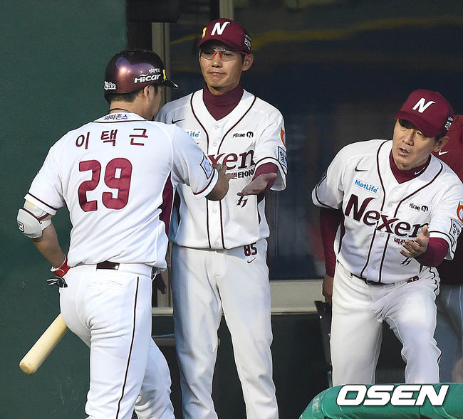 4회말 넥센 공격 선두타자로 나선 이택근이 추격의 중월 솔로포를 날리고 홈을 밟은 뒤 염경엽 감독과 인사를 나누고 있다.