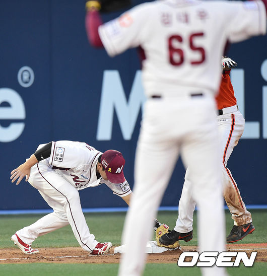 4회초 한화 공격 2사 1, 2루 상황 피에가 3루 도루를 시도했지만 넥센 3루수 김민성의 태그에 걸려 아웃되고 있다.
