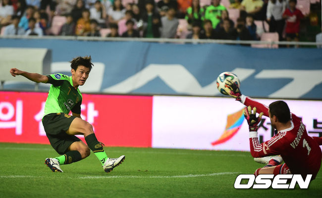전반 전북 한교원이 때린 슈팅을 올림픽크 리옹 베르쿠트르 레미가 막아내고 있다.