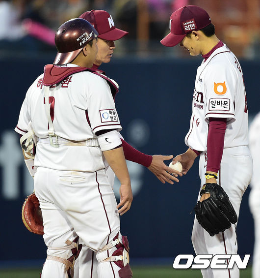 5회초 한화 공격 1사 1루 상황 넥센 선발 김대우가 마운드를 내려가며 이강철 코치에게 공을 건네고 있다.