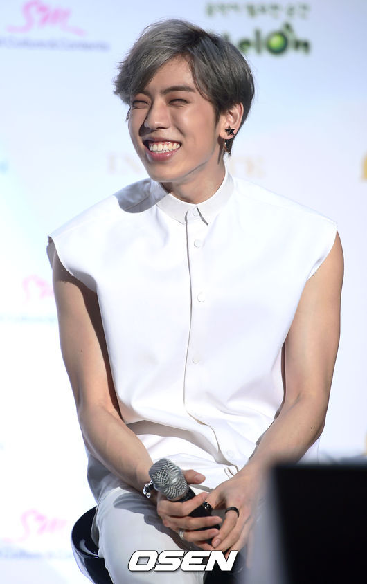 21일 오후 서울 잠실학생체육관에서 진행된 그룹 인피니트 컴백 기자회견 및 쇼케이스에서 인피니트 동우가 미소 짓고 있다.