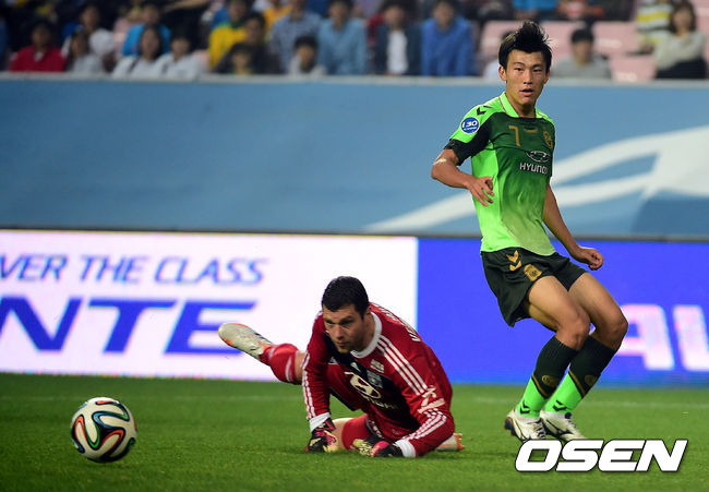 전반 전북 한교원이 때린 슈팅을 올림픽크 리옹 베르쿠트르 레미가 막아내고 있다.