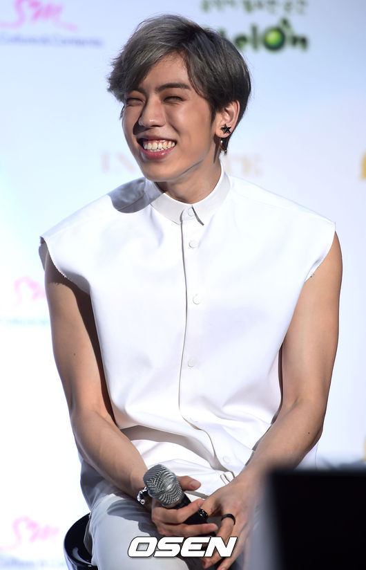 21일 오후 서울 잠실학생체육관에서 진행된 그룹 인피니트 컴백 기자회견 및 쇼케이스에서 인피니트 동우가 미소 짓고 있다.