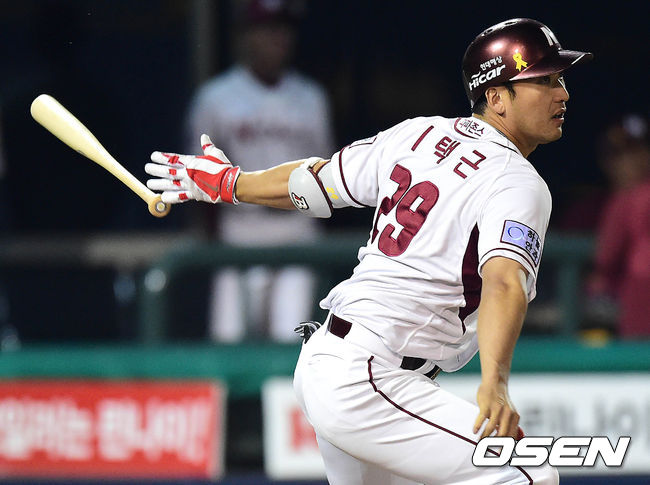 5회말 넥센 공격 1사 1, 3루 상황 이택근이 추격의 1타점 우익수 희생플라이를 날리고 있다.