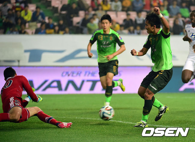 후반 전북 정혁이 때린 패널티킥을 올림픽크 리옹 고르겔린 마타유가 막아내고 있다.