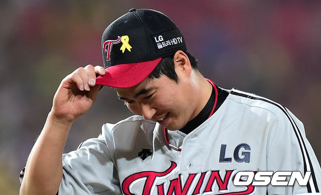 6회말 2사 1,3루에서 KIA 이범호를 외야플라이로 처리한 LG 우규민이 더그아웃으로 가며 미소를 짓고 있다.