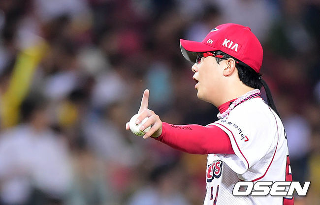 7회초 1사 2루 KIA 양현종이 벤치를 향해 더 던지겠다는 사인을 보내고 있다.