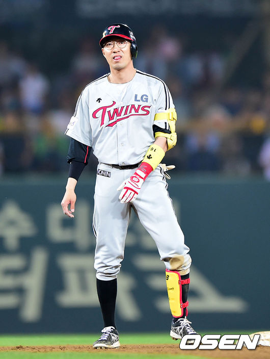 7회초 1사 2루 LG 정성훈이 우전 적시 2루타를 치고 타임을 외치고 있다.