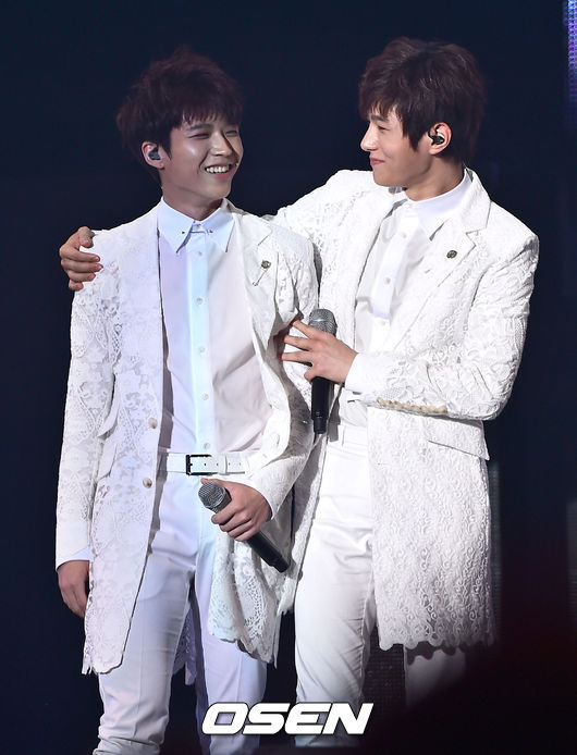 21일 오후 서울 잠실학생체육관에서 진행된 그룹 인피니트 컴백 쇼케이스에서 그룹 인피니트 우현과 엘이 미소 짓고 있다.