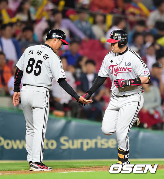 7회초 2사 2루에서 KIA 정의윤이 좌월 투런 홈런을 날리고 최태원 코치와 하이파이브를 하고 있다.