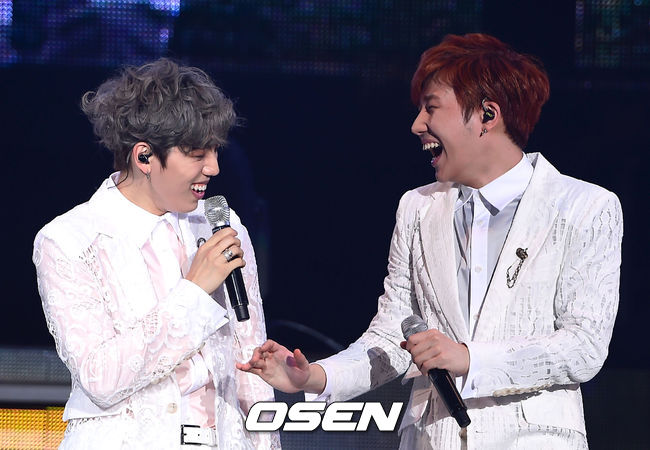 21일 오후 서울 잠실학생체육관에서 진행된 그룹 인피니트 컴백 쇼케이스에서 그룹 인피니트 동우와 성규가 미소 짓고 있다.