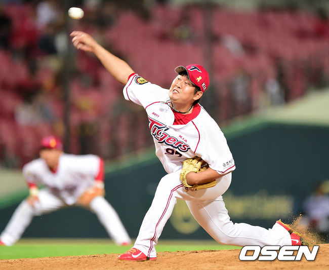 9회초 KIA 신창호가 힘차게 공을 던지고 있다.