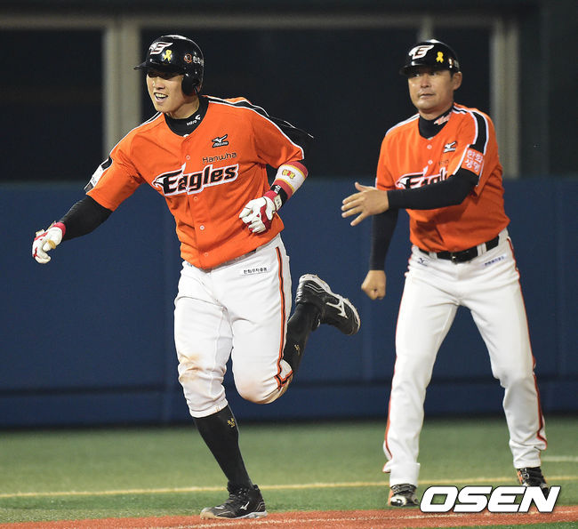 9회초 한화 공격 1사 주자없는 상황 정범모가 다시 앞서가는 중월 솔로포를 날리고 그라운드를 돌며 환호하고 있다.