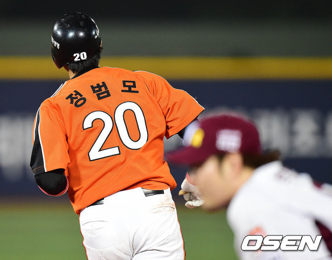 9회초 한화 공격 1사 주자없는 상황 정범모가 다시 앞서가는 중월 솔로포를 날리고 그라운드를 돌고 있다.