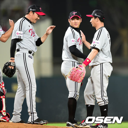 경기 종료 후 LG 봉중근이 동료들과 승리의 기쁨을 나누고 있다./sunday@osen.co.kr