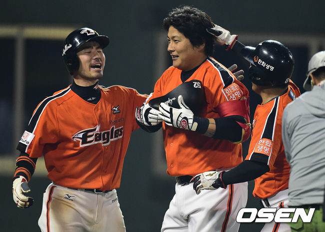 9회초 한화 공격 1사 만루 상황 김태균이 우월 만루포를 날리고 홈을 밟은 뒤 동료들과 환호하고 있다.