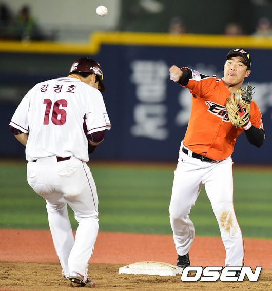 9회말 넥센 공격 무사 만루 상황 김민성의 내야 땅볼 때 한화 2루수 정근우가 강정호를 포스아웃 시킨 뒤 1루로 공을 뿌리고 있다.