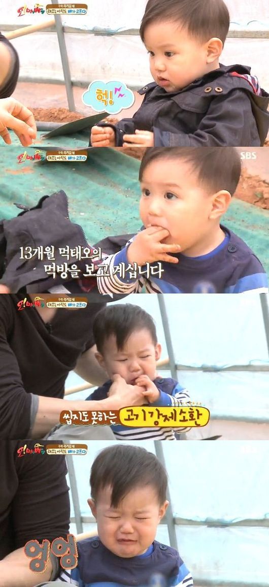 태오는 21일 오후 방송된 SBS 예능프로그램 '오 마이 베이비'에서 보쌈을 눈 앞에 놓고 13개월답지 않은 '폭풍 먹방'으로 눈길을 끌었다.