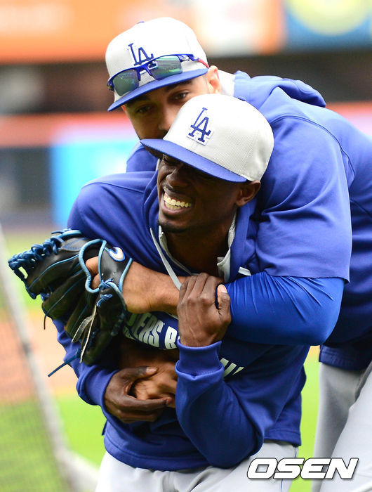 22일(이하 한국시간) 미국 뉴욕주 뉴욕 퀸스 시티 필드에서 열리는 '2014 메이저리그' 뉴욕 메츠와 LA 다저스의 경기 시작전 캠프와 고든이 장난을 치고 있다.