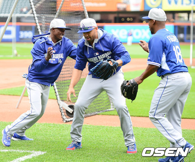 22일(이하 한국시간) 미국 뉴욕주 뉴욕 퀸스 시티 필드에서 열리는 '2014 메이저리그' 뉴욕 메츠와 LA 다저스의 경기 시작전 고든, 캠프, 피긴스가 장난을 치고 있다.