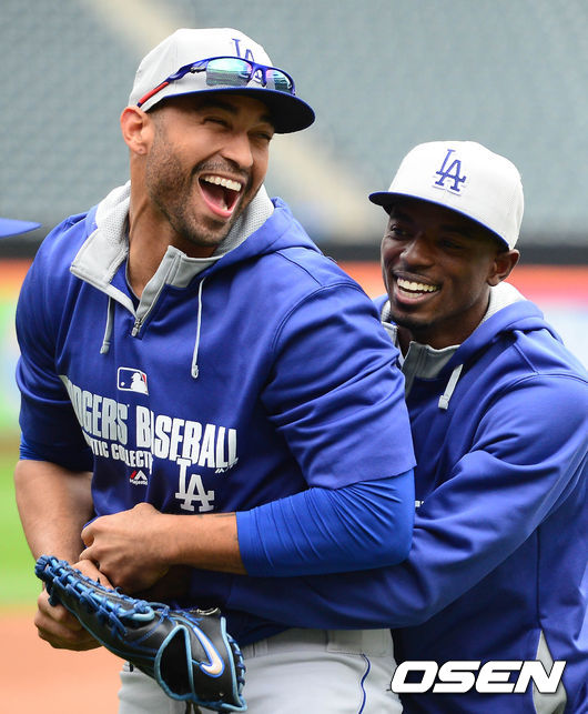 22일(이하 한국시간) 미국 뉴욕주 뉴욕 퀸스 시티 필드에서 열리는 '2014 메이저리그' 뉴욕 메츠와 LA 다저스의 경기 시작전 캠프와 고든이 장난을 치고 있다.
