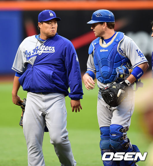 22일(이하 한국시간) 미국 뉴욕주 뉴욕 퀸스 시티 필드에서 열리는 '2014 메이저리그' 뉴욕 메츠와 LA 다저스의 경기 류현진이 A.J 엘리스와 더그아웃으로 이동하고 있다.