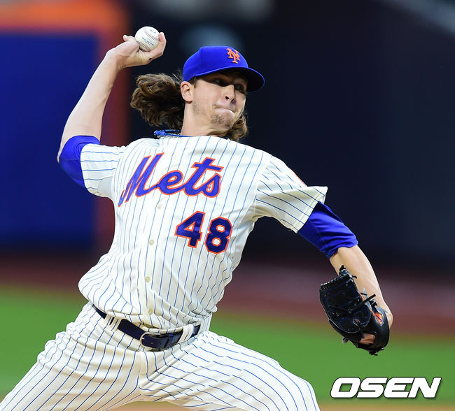 22일(이하 한국시간) 미국 뉴욕주 뉴욕 퀸스 시티 필드에서 열리는 '2014 메이저리그' 뉴욕 메츠와 LA 다저스의 경기 류현진의 맞상대 후안 제이콥 디그롬이 힘차게 공을 던지고 있다.