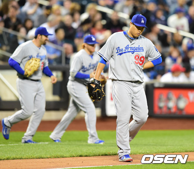 22일(이하 한국시간) 미국 뉴욕주 뉴욕 퀸스 시티 필드에서 열리는 '2014 메이저리그' 뉴욕 메츠와 LA 다저스의 경기 류현진이 마운드에 오르며 허리를 만지고 있다.