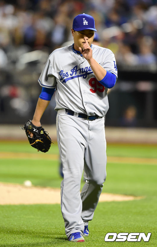 22일(이하 한국시간) 미국 뉴욕주 뉴욕 퀸스 시티 필드에서 열리는 '2014 메이저리그' 뉴욕 메츠와 LA 다저스의 경기 류현진이 3회말 2사 만루 위기를 삼진으로 넘기고 더그아웃으로 이동하고 있다.