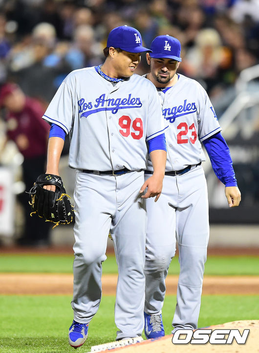 22일(이하 한국시간) 미국 뉴욕주 뉴욕 퀸스 시티 필드에서 열리는 '2014 메이저리그' 뉴욕 메츠와 LA 다저스의 경기 5회말 수비를 곤잘레스의 호수비로 무사히 넘긴 류현진이 밝은 표정으로 더그아웃으로 가고 있다.