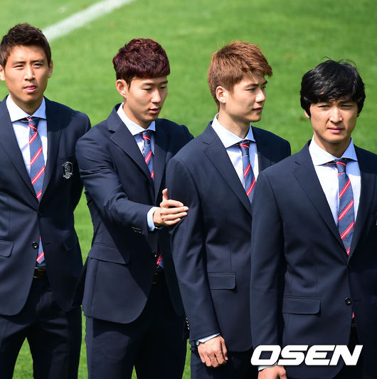 22일 오전 경기도 파주시 파주 NFC(대표팀 트레이닝센터)에서 브라질 월드컵에서 사상 첫 원정 8강에 도전하는 축구 국가대표팀이 공식단복 화보촬영 및 미디어타임을 가졌다. 손흥민이 기성용의 자세를 잡아주고 있다.