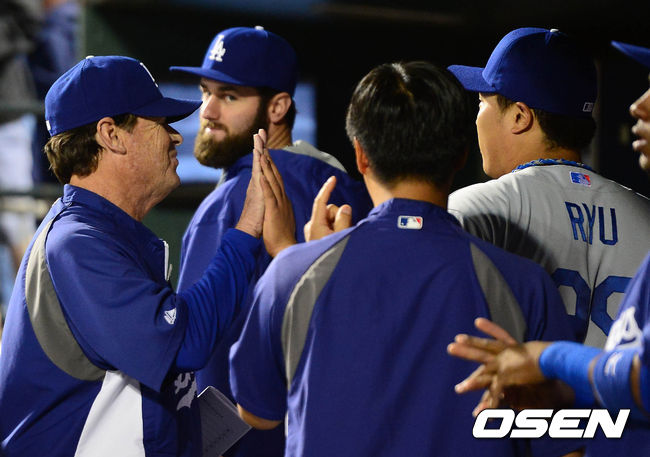 류현진이 마운드를 내려와 허니컷 코치와 하이파이브를 하고 있다. / baik@osen.co.kr