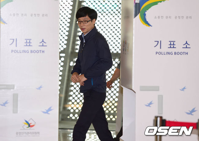 방송인 유재석이 투표장에 나와 기표를 마친 뒤 발걸음을 옮기고 있다.