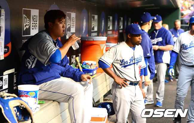 류현진이 경기 시작전 덕아웃에서 물을 마시고 있다. / baik@osen.co.kr